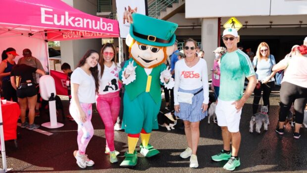 En la foto: De izquierda a derecha: Carolina Menéndez, interna de mercadeo de Eukanuba; Yina Cruz, directora de ventas y mercadeo de Eukanuba; Patrick, la mascota de San Patricio Village; Lizette Díaz, presidenta de PetSOS e InDog. Adolfo “Tito” González, presidente de Empresas Caparra.