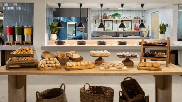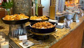 El bufé comienza con sopas caseras como la crema de calabaza con coco caribeño, y continúa con estaciones de charcutería, quesos y panes artesanales. Las ensaladas frescas y compuestas aportan un equilibrio ligero y colorido, mientras que la selección de carnes y acompañamientos calientes incluye pavo y jamón glaseados, filete de NY, lomo de cerdo en salsa de tamarindo, flank steak con chimichurri, vegetales asados, arroz con gandules, puré de ajo y coles de Bruselas con miel y tocino. La experiencia culmina con un variado surtido de postres clásicos de la temporada, como tartaletas de pecanas, tarta de calabaza, tembleque, arroz con dulce y shortcake de fresa.