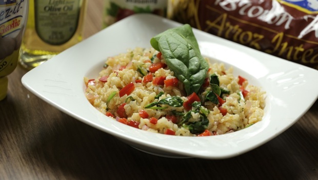 - Cocine el arroz, según las instrucciones del paquete (tiempo de cocción 40 minutos). Aparte, caliente el aceite en una sartén mediana a fuego medio-alto. Agregue la cebolla y el pimiento; cocine hasta que los vegetales estén suaves, por 7 minutos aproximadamente. Agregue la espinaca y el ajo y cocine hasta que la espinaca esté tierna y el ajo esté oloroso, alrededor de 1 minuto más.