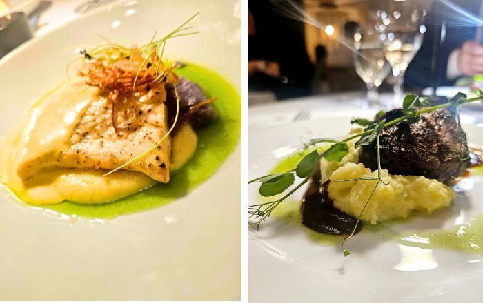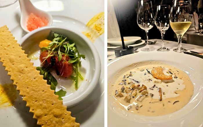 La experiencia comenzó con una sopa de shiitake y portobello con salvia, jugo de trufa y florón, seguida por una ensalada de tomates con micro-verdes locales, glaseado balsámico, sorbete de tomate, albahaca y lavash crujiente.