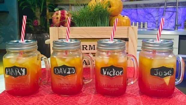 Mezclar todos los ingredientes y servir con hielo y frutas.