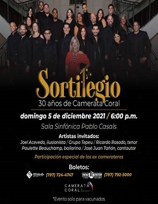 Camerata Coral de Puerto Rico celebrará su 30º aniversario con su concierto “Sortilegio”, que se presentará en la Sala Sinfónica Pablo Casals en Santurce, el domingo, 5 de diciembre a las 6:00 p.m. El repertorio incluirá temas significativos interpretados por la Camerata Coral de Puerto Rico en estas 3 décadas.
