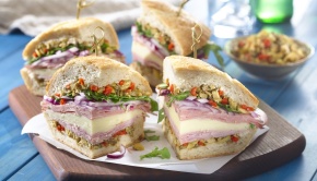 Una torre de finas rebanadas con cortes fríos y vinagreta con Aceitunas de Manzanilla Rellenas de Pimientos GOYA®.