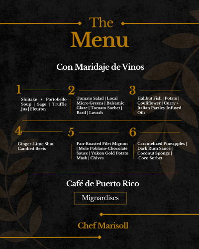 Durante la velada, los asistentes disfrutarán de un menú de degustación de cinco tiempos diseñado por la Chef Marisoll, cuidadosamente maridado con una exquisita selección de vinos para resaltar la fusión de sabores y texturas. La experiencia comenzará con una sopa de shiitake y portobello con salvia, jugo de trufa y florón, seguida por una ensalada de tomates con micro-verdes locales, glaseado balsámico, sorbete de tomate, albahaca y lavash crujiente.