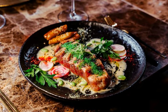 Seared Bluefin Tuna: Preparado con una técnica de sellado que conserva la frescura del atún, se presenta con kombu sauce, tobiko y wasabi peas, logrando un plato vibrante en sabor, textura y color.