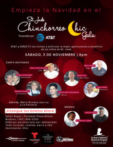 Estamos a sólo días de la celebración del St. Jude Chinchorrero Gala, evento en el que reconocidos chefs locales donan su participación y confeccionan exquisitos platos inspirados en nuestra cocina tradicional. Este año la actividad se celebrará nuevamente en el Hotel Condado Plaza Hilton, pero en el Salón Royal, el sábado 3 de noviembre, a las 8:00 p.m.