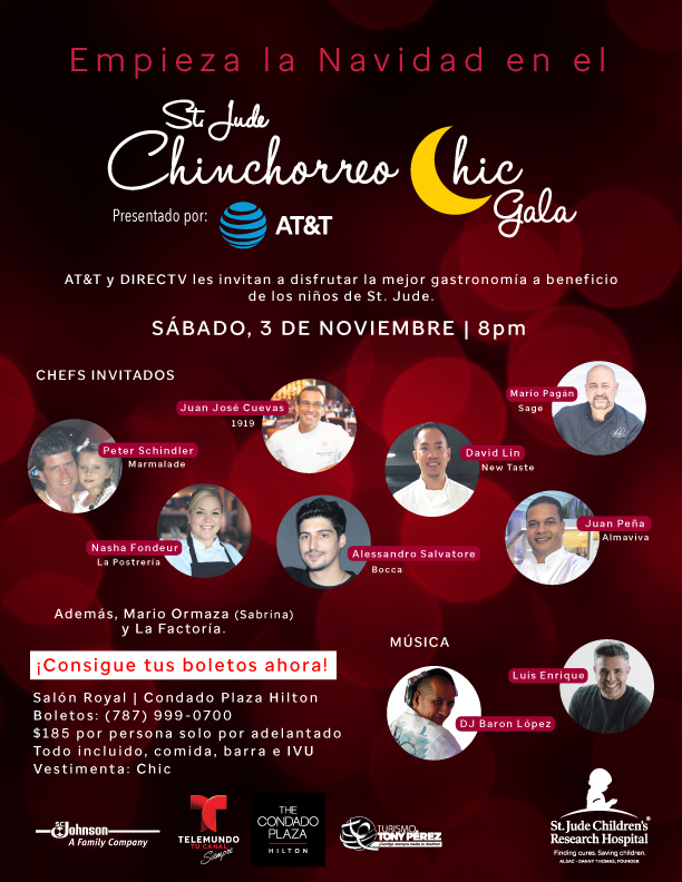 Estamos a sólo días de la celebración del St. Jude Chinchorrero Gala, evento en el que reconocidos chefs locales donan su participación y confeccionan exquisitos platos inspirados en nuestra cocina tradicional. Este año la actividad se celebrará nuevamente en el Hotel Condado Plaza Hilton, pero en el Salón Royal, el sábado 3 de noviembre, a las 8:00 p.m.