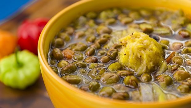 Monde el plátano, lávelo, cúbralo con el jugo de limón y rállelo finamente. Sazónelo a gusto y forme bolitas de igual tamaño. Agréguelas a los gandules, moviendo la olla dos o tres veces. Cocínelos a fuego lento hasta que estén cocidos y el caldo tenga consistencia espesa.