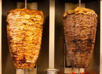 - Kebab o Shawarma – Presenta la técnica árabe de cortar y montar finas rebanadas de cordero que se colocan sobrepuestas en forma de cono que gira sobre un asador, del cual vuelven a cortarse rebanas que se sirve en pan pinta junto con varios ingredientes y salsas.