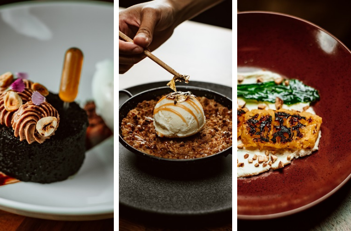 Chocolate Rum Cake, Hazelnut Mousse and Coconut Sorbet; Pumpkin Batata Cazuela, Ice Cream de Queso, Ginger Streuse y Warm Spiced Pineapple con Queso la Central, Cristal de Recao and Almonds. Suministradas.