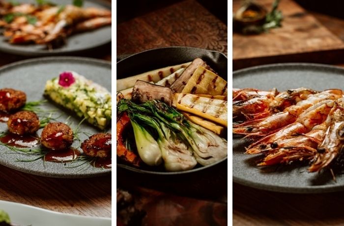 De izq. a derecha: Sofrito Lobster Cakes y Guavarum Glaze, Avocado, Flora, Coconut Flakes; Vegetales a la brasa y Langostinos al ajillo de achiote. Suministradas.
