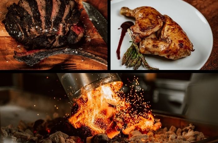ANGUS TOMAHAWK with Charred Brussel Sprouts en Añejo Pomegranate Syrup; SUGAR CANE CHICKEN en Garlic and Herb Marinade and Asparagus in Black Vinegar y una vista de la fabulosa brasa. Suministradas.