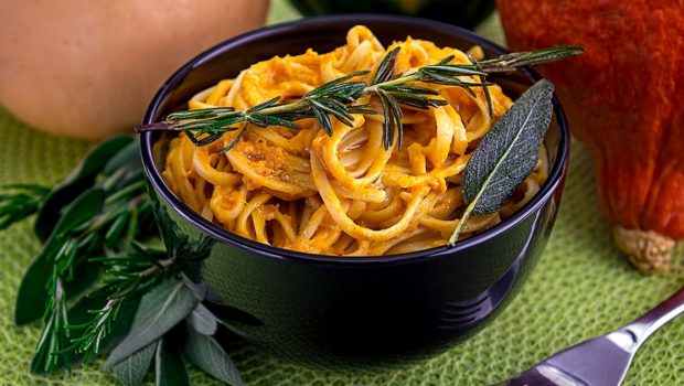 En un sarten a fuego mediano, sofría el romero y la salvia por un minuto. Retire del fuego y reserve. Sofría el ajo por un minuto y añada la calabaza, la leche, el queso, la canela y la nuez mozcada. Sazone a gusto con sal. En otra olla, cocine la pasta según las instrucciones. Reserve dos tazas de agua de pasta para ajustar la consistencia de la salsa. Ajuste la salsa y combine con la pasta. Sirva.
