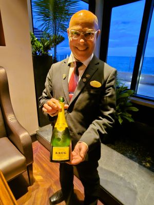 Luis Simoes, Sommelier de 1919, nos muestra la etiqueta del maravilloso Champagne Krug con el que brindamos. Foto: PlaceresPR.com