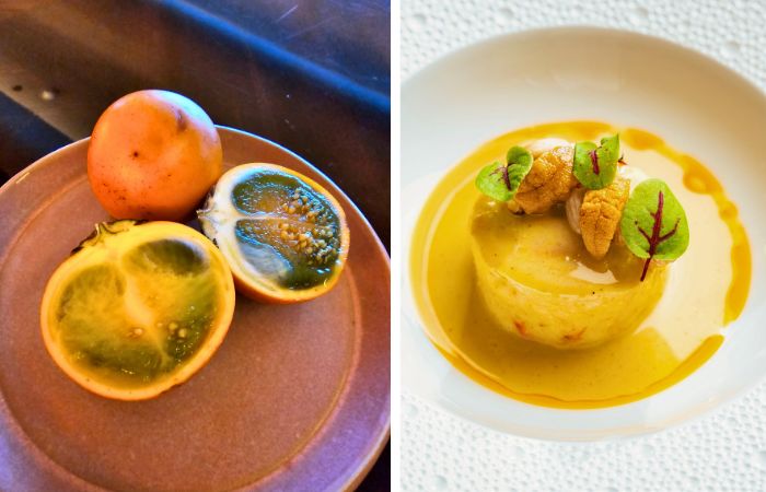En izquierda, el Lulo (foto – PlaceresPR), una fruta local con la que Chef Ciarán confecciona la emulsión del plato Crab Boudin Blanc, en derecha. (foto- suministrada).