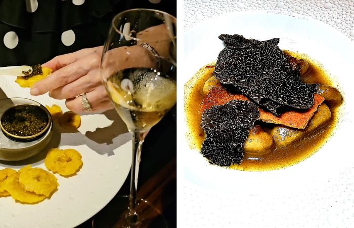 Ossetra Caviar w/tostones (izq.) y Malanga Gnocchi con Trufas Negras de Invierno. Fotos: PlaceresPR.com