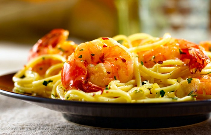 Pasta Gourmet con camarones. Suministrada.