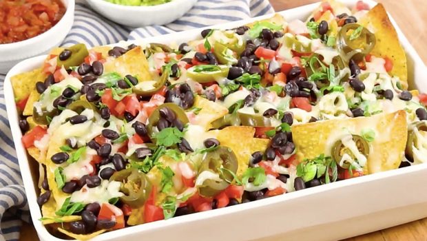 Poner los Chip en un recipiente. Agregar y esparcir todos los ingredientes en los chips. Luego, hornear por 5 minutos. ¡Buen Provecho!