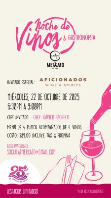 La experiencia estará guiada por un sommelier de Aficionados Wine & Spirits, junto al chef invitado Xavier Pacheco y el chef ejecutivo de Il Nuovo Mercato, Paolo Cafarelli, quienes juntos ofrecerán un menú de cuatro tiempos diseñado para resaltar cada vino seleccionado del portafolio de Aficionados. Los asistentes disfrutarán de una cata guiada y un recorrido gastronómico que promete ser inolvidable, mientras apoyan la labor de la Sociedad Americana Contra el Cáncer en su aniversario.