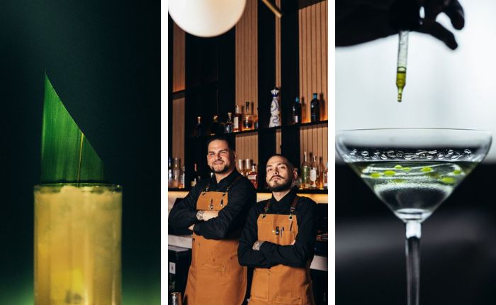 Al centro, los mixólogos Anthony Vargas y Luis González. En izquierda el coctel “Ser Humilde” y en derecha, “Clorofila”. Suministradas.