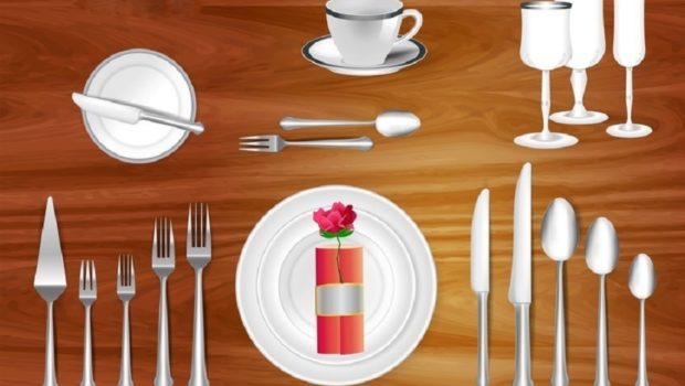 - Cubiertos – No deben ponerse cubiertos demás, si no los que van a utilizarse de acuerdo al menú que será servido. La servilleta, que debe estar conjuntada con el mantel o combinar de alguna manera con la decoración de la mesa, debe estar doblada de forma elegante y puesta sobre el lado izquierdo del plato de cada comensal junto con la cantidad de tenedores necesaria. Si hay dos tenedores solamente, para ensalada y plato principal, el de la ensalada irá hacia afuera y el del plato principal más cercano a éste. Del lado derecho del plato debe ponerse la cuchara de sopa (hacia afuera) y luego los cuchillos necesarios. Si se sirviera de aperitivo algún fruto de mar, debe ir del lado derecho, antes de la cuchara de sopa. El cuchillo debe tener siempre los “dientes” del lado del plato. Los cubiertos se posicionan en el orden en que serán utilizados, desde la parte de afuera hacia adentro del plato. La cucharita y/o tenedorcito del postre pueden ir en la parte superior del plato principal, del lado izquierdo de las copas.