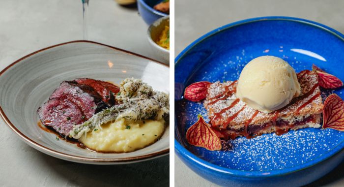 El pollo asado en mole verde acompañado de papas pequeñas y hierbas frescas; el Fish Tikka es un filete de halibut marinado en yogur y especias, servido con arroz aromático y salsa makhani; cerdo ibérico con papas fondant y glaseado de tamarindo; y el beef strip, que combina lomo fino, puré de papas, brócoli al estilo cacio e pepe y mantequilla avellanada.