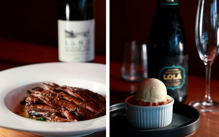 Tercer Plato – Budín de tarta de manzana con helado, acompanado del Lola Espumoso de Albariño Brut
