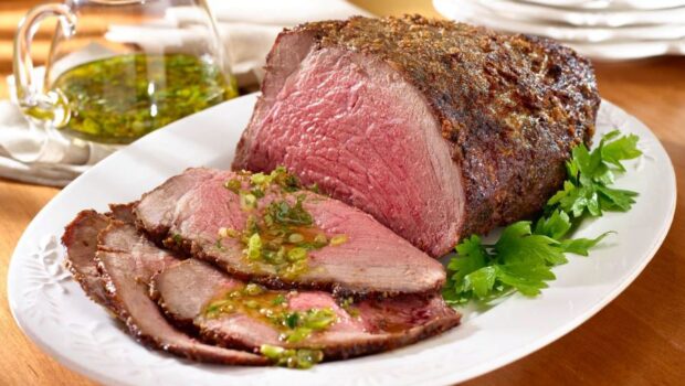 2. Caliente el horno a 500°F. Coloque la carne con la capa de grasa hacia arriba, en una bandeja para hornear forrada con papel aluminio, y traslade al horno. Inmediatamente reduzca el calor a 425°F. Ase la carne hasta que se vea de color marrón oscuro, dorada y la temperatura interna registre 125°F en el termómetro de lectura rápida, para un término medio, alrededor de 1 hora. (Tenga en cuenta que en el centro de carne quedará en término medio, mientras que los extremos quedarán bien asados). Traslade la carne asada a un plato y cúbrala con papel aluminio para mantener el calor, por lo menos 30 minutos antes de cortarla.