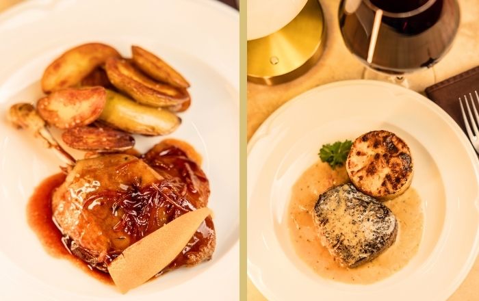 Confit de pato a la naranja con papas fingerling y filete mignon prime con costra de pimienta y papas gratinadas al estilo Dauphiné. Fotos: Suministradas.