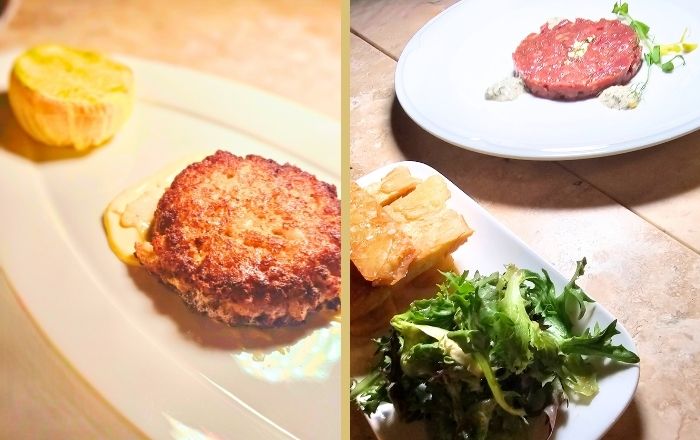 - Tartare de boeuf, (tártaro de filete mignon con papas fritas de pana, ensalada verde y salsa gribiche de trufa); y el tradicional, Canard confit à l’orange, (confit de pato a la naranja con papas fingerling) fue acompañado por el magnífico Domaine LaRue Blagny Premier Cru Sous Le Puits 2019, Bourgogne fue la pareja perfecta para el